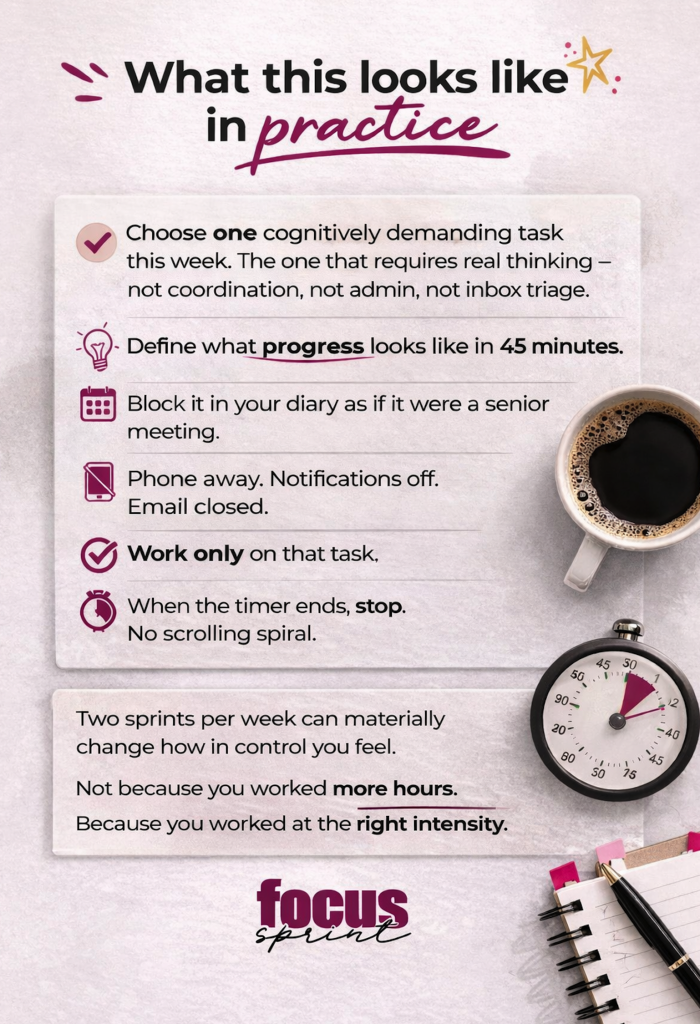 A Focus Sprint is a deliberately protected burst of deep, undistracted work with a defined objective and a defined stop point.